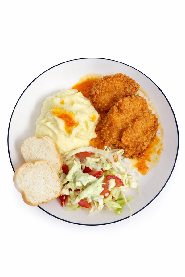 <span data-description-text>Комплексный обед: хрустящее куриное филе в кляре (2 шт., 150 г), нежное сливочное пюр...</span>