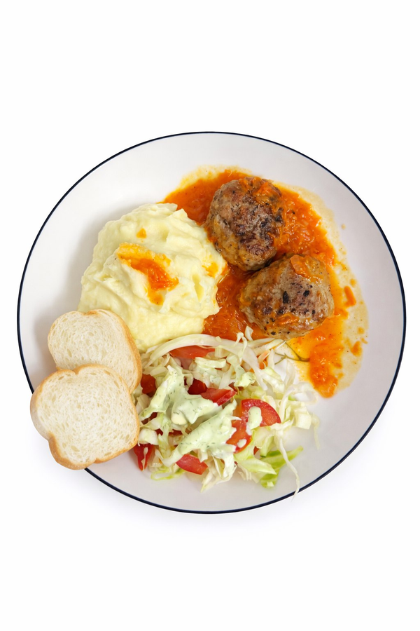 <span data-description-text>Комплексный обед: сочные свино-говяжьи котлеты (2 шт. — 150 г) с ароматной подливой, ...</span>