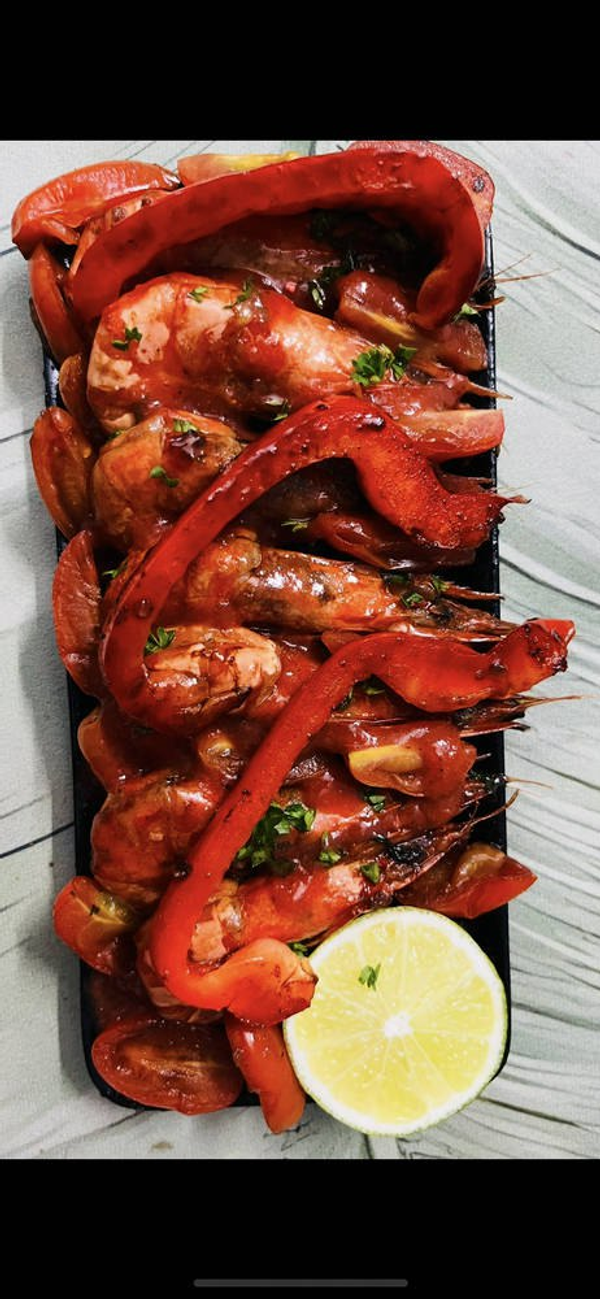 Крупные, сочные и мясистые креветки (примерно 7–8 штук в порции). Идеально приготовлены, чтобы сохранить натуральный вкус и текстуру. Подаются с долькой лайма, ароматной зеленью и фирменным соусом. ">
