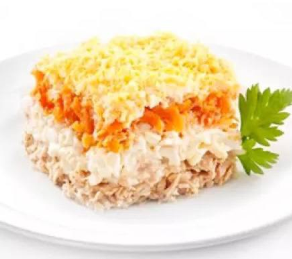 Состав: картофель, тунец, яйца, морковь, грибы, сыр, майонез. ">