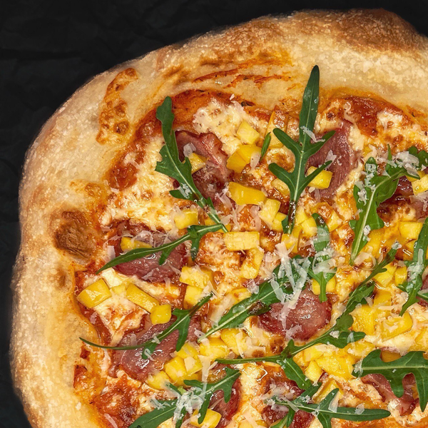 Состав: тесто из итальянской муки на биге, крафтовый пицца-соус, моцарелла, пармезан, манго, острый соус «Табаско Чипотле», руккола.