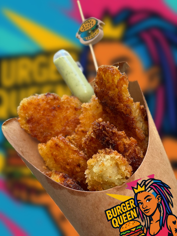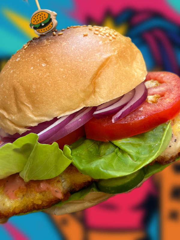 Огромная куриная котлета из сочного цельного филе в хрустящей панировке, с маринованными огурчиками, свежим салатом, томатом, луком и двумя соусами — бургерным и пикантным красным. Сытно, сочно, хрустит!">